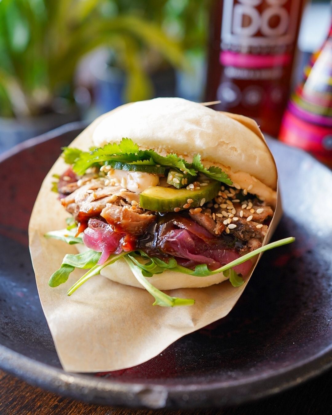 1 sztuka w porcji - bułka na parze z szarpaną wieprzowiną, chipotle mayo, rukolą, mango, piklowaną czerwoną cebulą, kolendrą i szczypiorkiem Opłata SUP