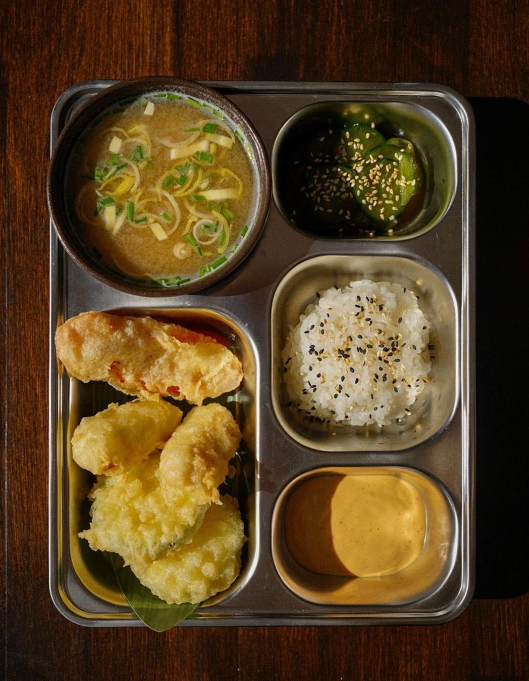 7 szt. warzywa, ryby, owoce morza w cieście z mąki pszenno-ryżowej z dwoma sosami