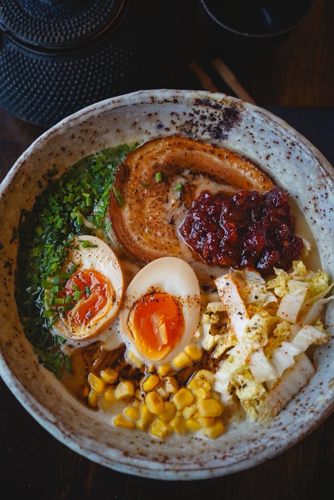 Shoyu Wege Ramen - Esencjonalny warzywny bulion/ tare na bazie sosów sojowych/ łuskane fasolki edamame/ pieczona mini kukurydza/ chipsów z batatów/ pak choi/ krążki cebulowe/ marynowane jajko/ grzyby shitake/ szczypior Opłata SUP -